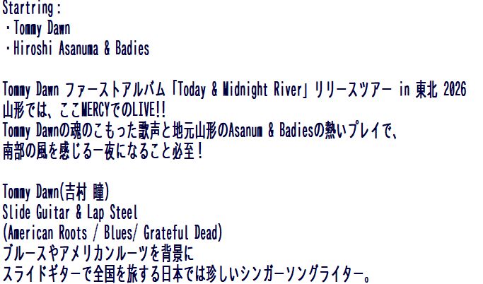 ホームおすすめライブ 4/15(水) Bluesy Night!in MERCY 4/15(水) Bluesy Night!in MERCY 7:00PMオープン 7:30PMスタートテーブルチャージ:1,500円 ミュージックチャージ:2,000円要ドリンクオーダー 予約